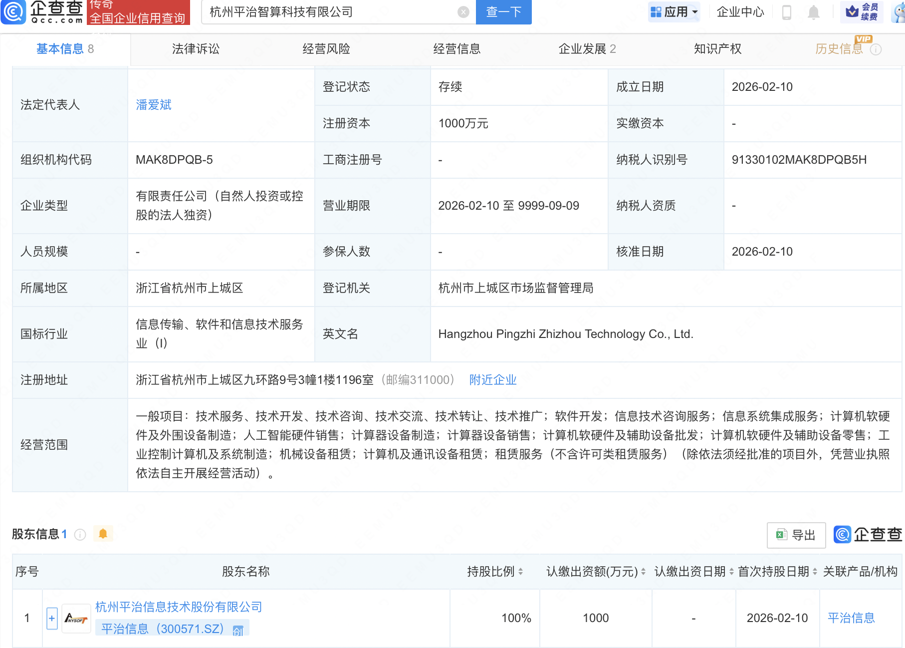 近日,杭州平治智算科技有限公司成立,注册资本1000万元,经营范围包含:信息系统集成服务;计算机软硬件及外围设备制造;人工智能硬件销售;计算器设备制造;计算器设备销售等。企查查股权穿透显示,该公司由平治信息(300571)全资持股。