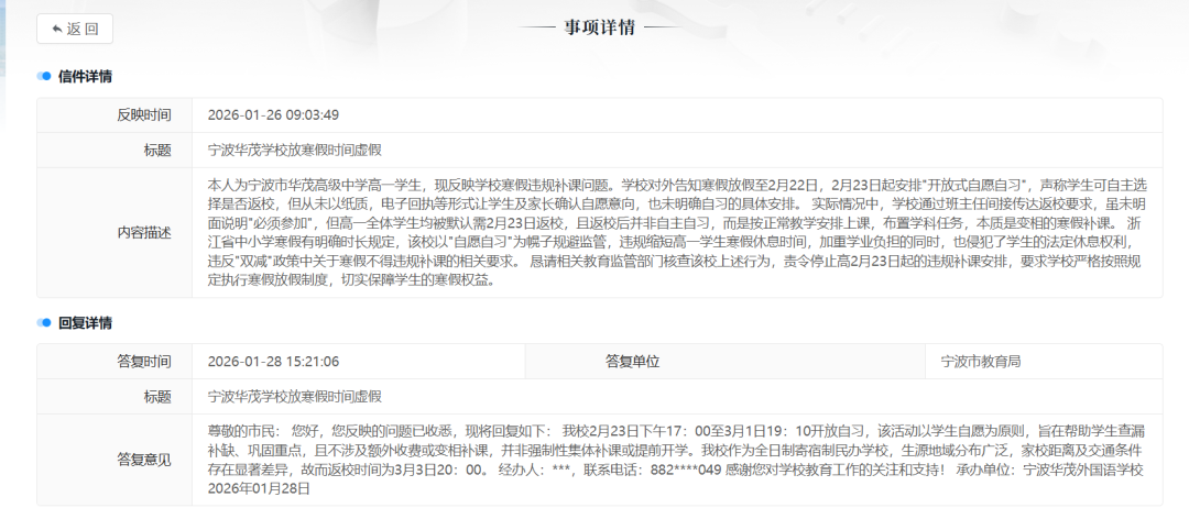 随着春节假期收尾,关于提前上课的投诉越来越多。鹿姐姐在“民呼我为”平台上搜索,也发现了几条关于“寒假时间虚假”“强制提前开学”的投诉。不止浙江,广东、湖南、重庆等地也陆续出现相关的投诉和举报。
