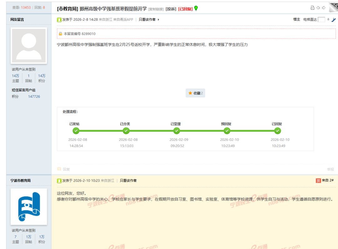 早在春节前,就有宁波网友在民生e点通留言,吐槽当地某中学让强基班学生2月25日返校,认为此举打乱学生正常休息节奏,大幅增加学业压力。