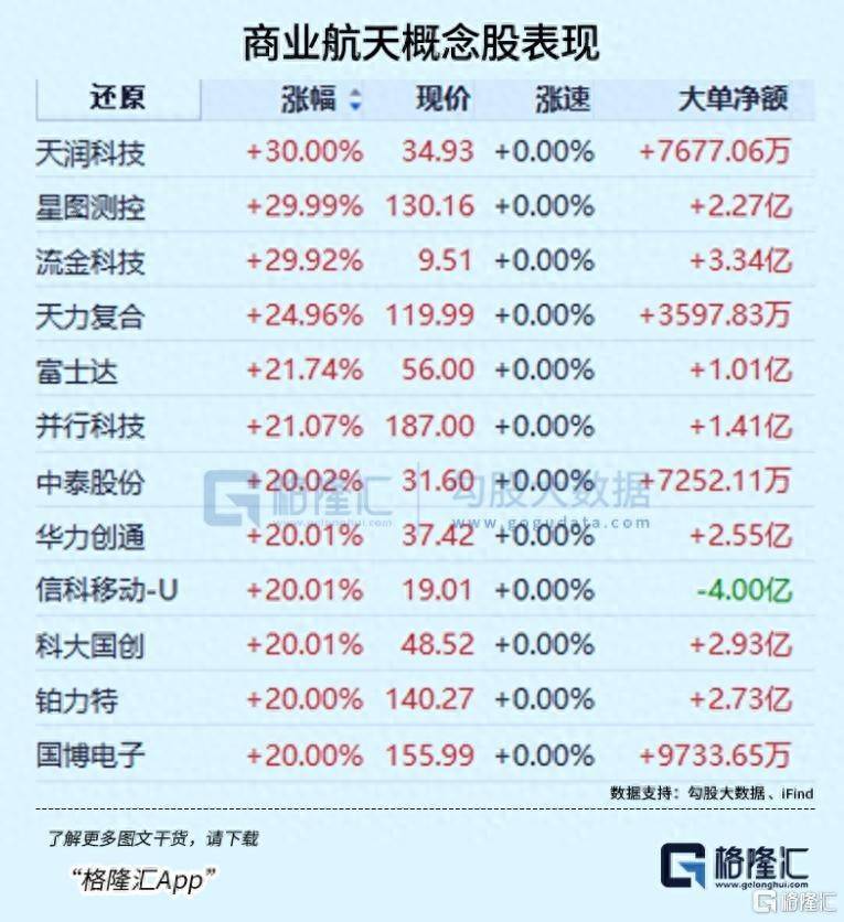 具体来看,商业航天概念股反复活跃,鲁信创投12天10板,金风科技5连板,通宇通讯4天3板,杭萧钢构3连板,天奥电子、中国卫星涨停。