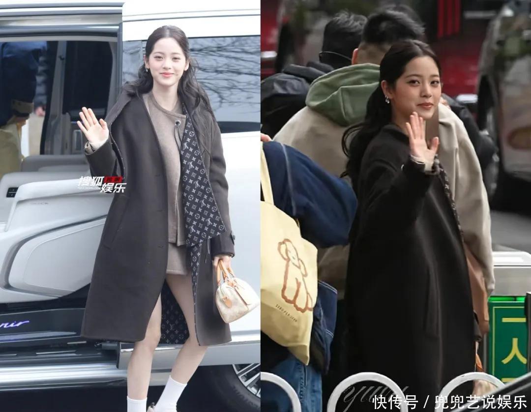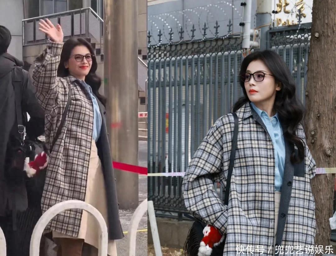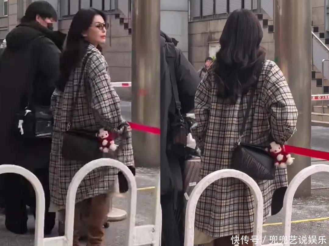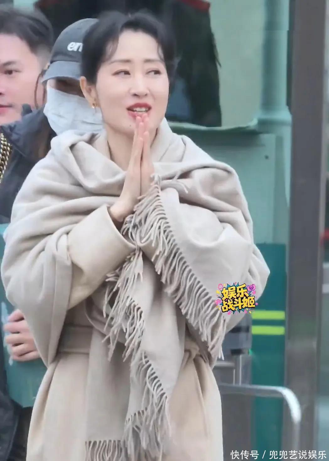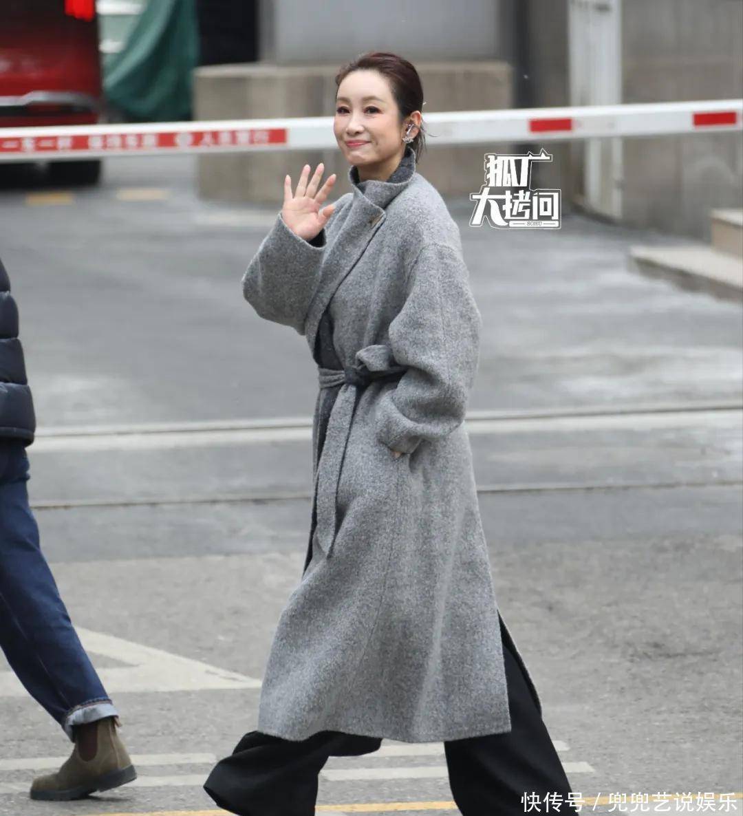 下班时刘敏涛化了全妆,换成一套棕色风衣,还披了一条同色系的披风,保暖且看起来更有亲和力。