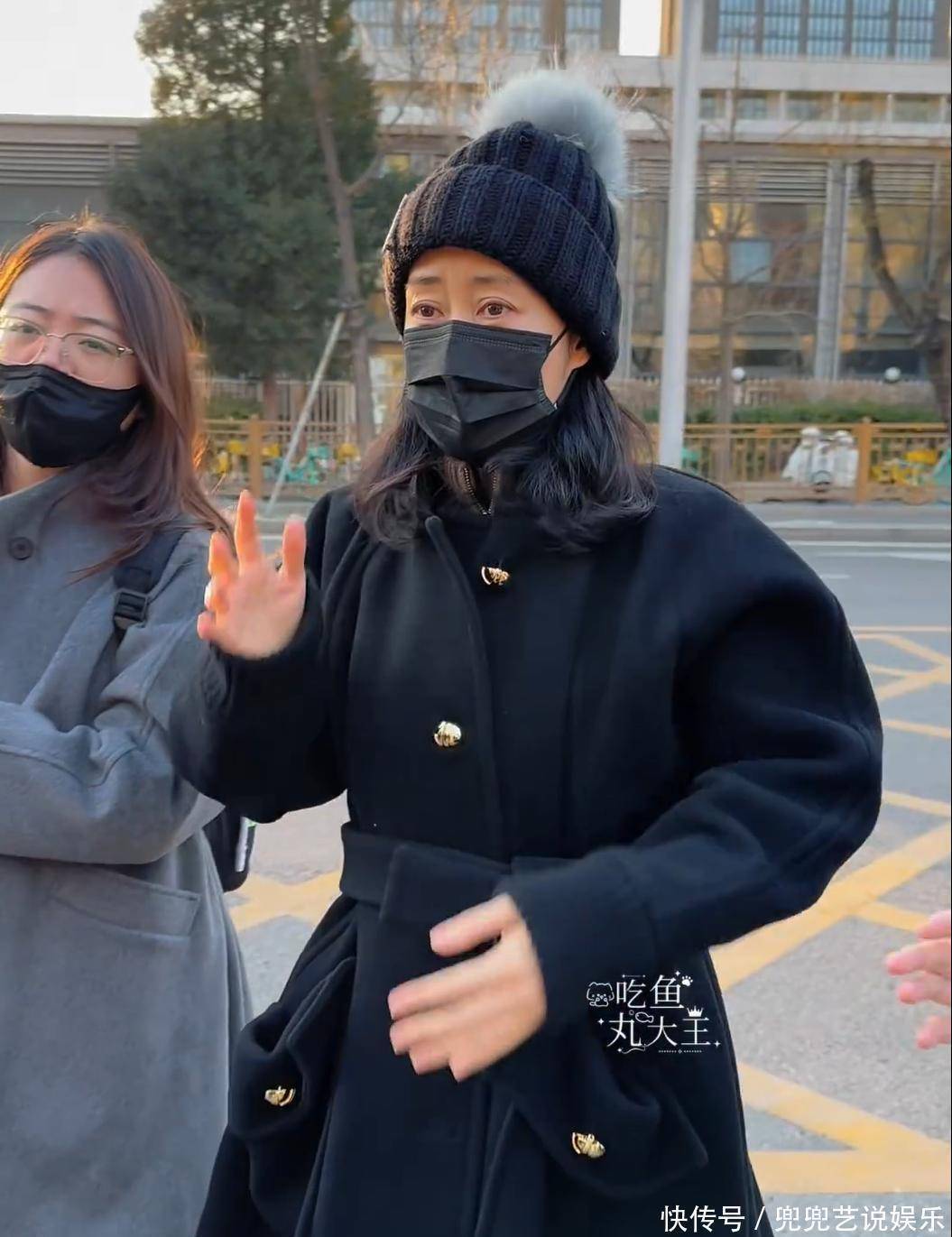 同年龄段女星里,刘敏涛也穿了大衣,还是比较沉稳的黑色,不过她戴了一顶毛绒帽子,不仅保暖,还多了几分可爱和青春气息。